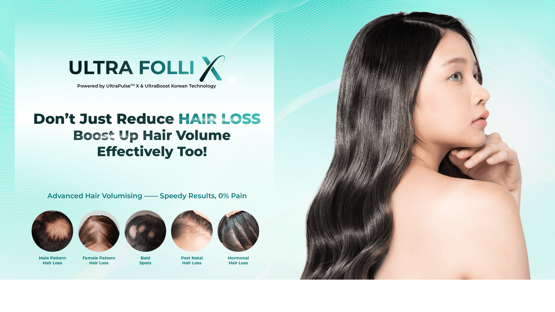 Introducing Hair Doc Ultra Folli X with cutting-edge UltraPulse™ X and UltraBoost Technology. Our advanced solution for hair volumising. It reactivates dormant follicles and manages hormonal (DHT) hair loss.